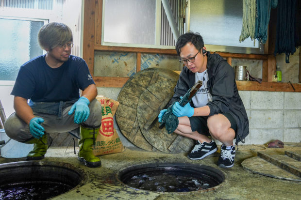 坂田織物は藍染め・手織り、化学染料染め・機械織りの両方の行程を見学できる貴重な織元。職人の案内で工房内を見学します。
