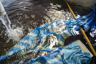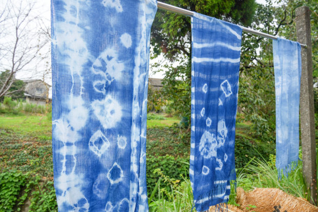 坂田織物で織られた白地の久留米絣生地を藍染め。グラデーションや絞り、縞模様など、職人と相談しながらオリジナルのストールを作ります。