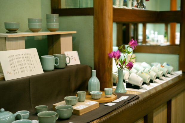 町歩きの途中では、鍋島虎仙窯のギャラリーに併設された「喫茶こせん」で、鍋島焼の器に入れたコーヒーまたは紅茶をお楽しみください。鍋島虎仙窯は元々青磁を得意とした窯元。焼成の温度調整が難しく、10個焼いても1~2個しか残らないと言われる青磁を、「多くの人に使ってもらいたい」という思いで研究を重ね安定供給することに成功しました。ギャラリーには、そんな鍋島虎仙窯の青磁はもちろん、色鍋島や染付など様々な作品も展示販売されています。
