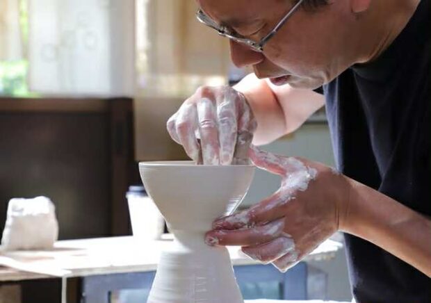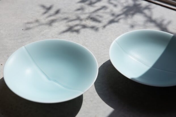 美しい質感とフォルムが唯一無二の青磁を生み出している窯元です。青木陶房の最大の魅力は、半艶消しの調合釉を施した「氷青磁」というシリーズ。窯主である青木昌勝さんは、人とは違う、自分だけの青磁を追求する中で、あるときアルゼンチンの世界遺産「ロス・グラシアレス氷河群」と出会いました。そして、氷河から着想を得て、「氷青磁」と呼ばれる独自の青磁を生み出したのです。また、青磁と同じ釉薬を使いながら、陶土を使用することで、焼成後に貫入(ひび)を入れる「青瓷」というシリーズも作っています。
