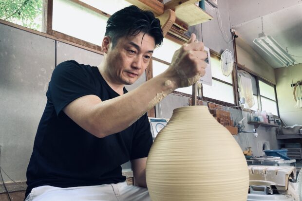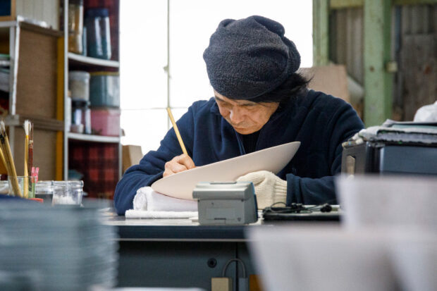 鍋島焼の伝統的技法を大切にしながら、独自の世界観の作品を作っている窯元です。代表の山本拓男さんは鍋島焼に多くみられる「墨弾き」という技法を進化させ、藍色ではなく黒色の呉須を使用することで緑色の「鍋島染付」という表現を作り出しました。絵画のような奥行きに引き込まれる『染付墨弾きシリーズ』は山本さんが試行錯誤しながら生み出した唯一無二の表現です。このツアーでは、山本さんにお話しをお伺いしたのち、「墨弾き」の実演をしていただきます。
