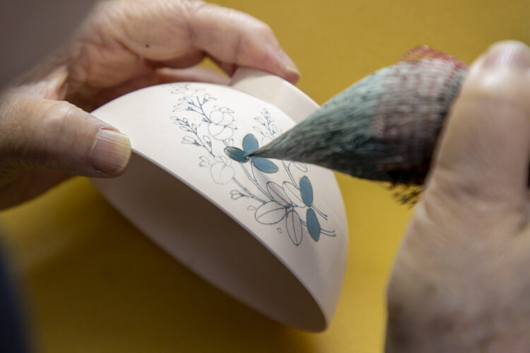 伝統工芸士である大林吉幸がろくろ、妹さんが下絵、お母さんが濃み・赤絵と、ご家族で作陶しており、ギャラリーも工房もどこかぬくもりのある雰囲気が魅力的な窯元です。成形には手ろくろを使用しており、手作業ならではのやわらかな曲線が生み出されています。また、作品に施されている絵付けは、すべて手書き。その時々の季節感が繊細に描かれており、作品を通して季節を感じることができます。このツアーでは色鍋島の絵付けの様子をご覧いただきます。