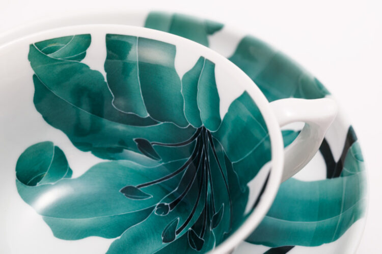 伊万里鍋島焼には3種類の様式が定められています。まず、赤、黄、緑の3色を基調とした上絵具の絵付けが特徴的な「色鍋島」。次に、呉須(ごす)と呼ばれる藍色の顔料一色で描かれた「鍋島染付」。そして、鉄分を含む釉薬を施して焼成された、淡い透明感のある緑色が特徴的な「鍋島青磁」。現在でもこれらの伝統的な様式は受け継がれており、その上でそれぞれの窯元が独自の表現に向き合っています。